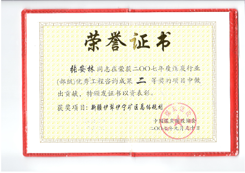 主持设计的《山西潞安矿区总体规划》、《陕北煤炭基地规划》、《新疆大型煤炭基地规划》等8个项目先后获得煤炭行业优秀工程咨询成果特等、一等、二等、三等奖及国家优秀咨询一等奖。参与设计的活鸡兔、凤凰山和姚桥矿井先后获得国家设计金、银奖。