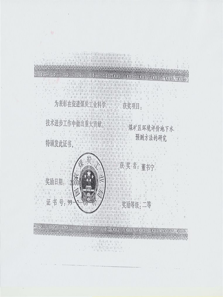 21.2000年煤炭工业科技进步二等奖--煤矿区环境评价地下水预测方法的研究,排名第7;