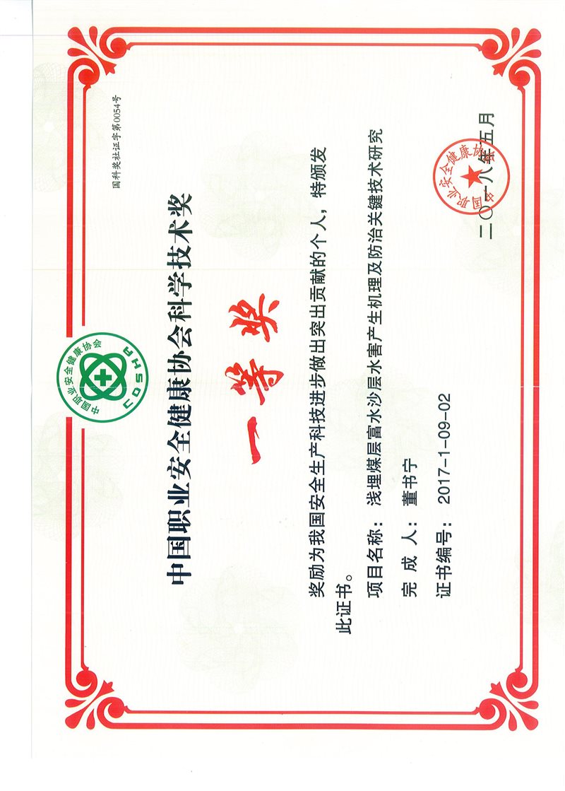 3.2018年中国职业安全健康协会科学技术一等奖--浅埋煤层富水沙层水害产生机理及防治关键技术研究,排名第2;