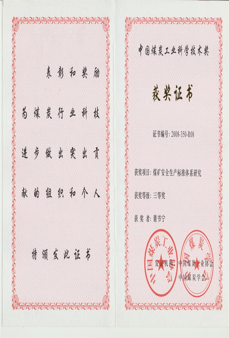 26.2008年中国煤炭工业科学技术三等奖--煤矿安全生产标准体系研究,排名第8;
