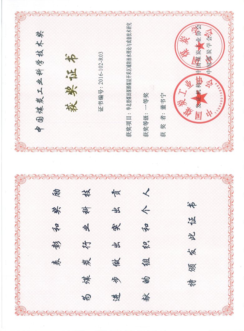 11.2014年中国煤炭工业科学技术一等奖--动水大通道突水钻孔控制注浆高效封堵成套技术,排名第2;