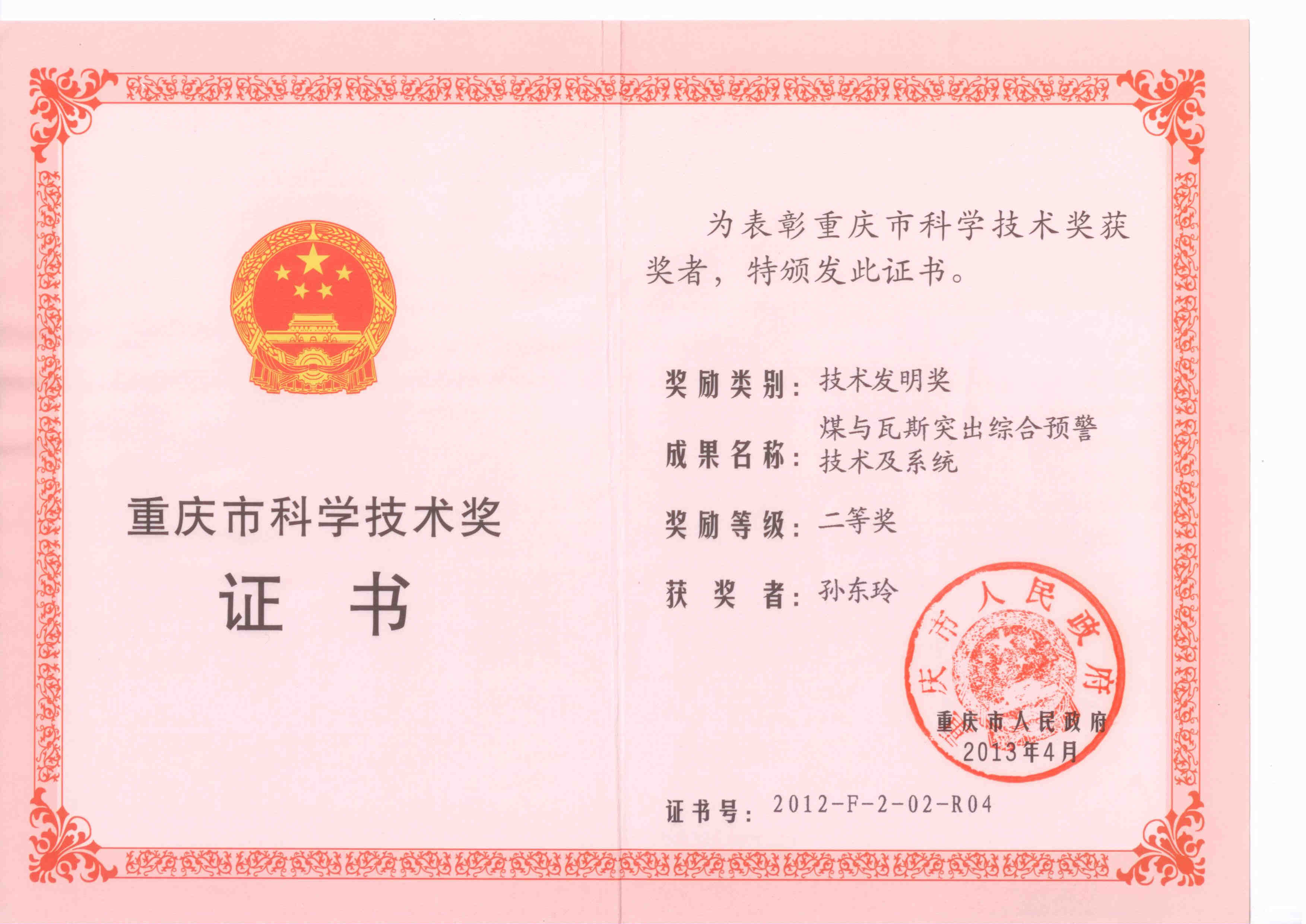 [8]2012年“煤与瓦斯突出综合预警技术及系统”获重庆市技术发明奖二等奖