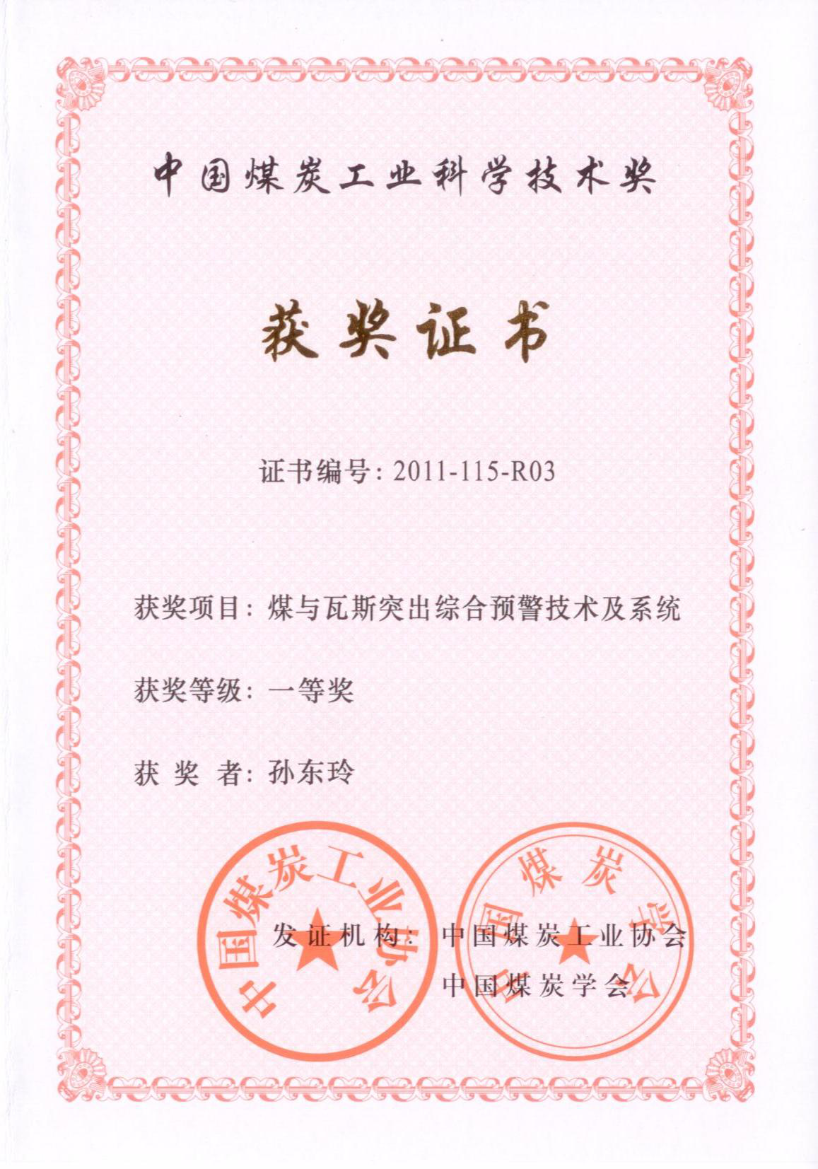 [3]2011年“煤与瓦斯突出综合预警技术及系统”获中国煤炭工业科学技术奖一等奖
