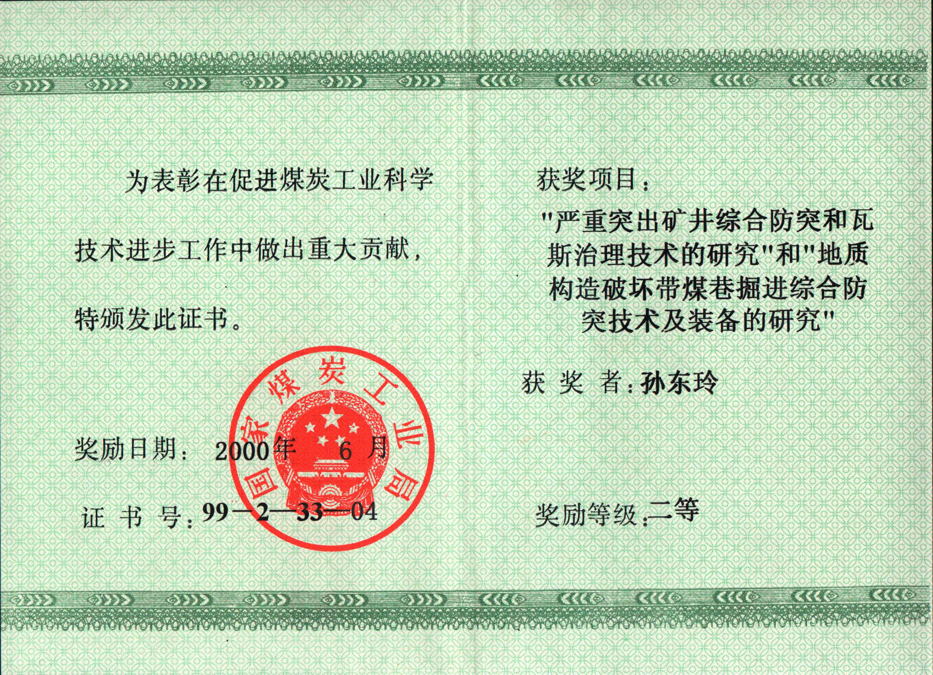 [9]2000年“严重突出矿井综合防突和瓦斯治理技术的研究”获煤炭工业科技进步奖二等奖