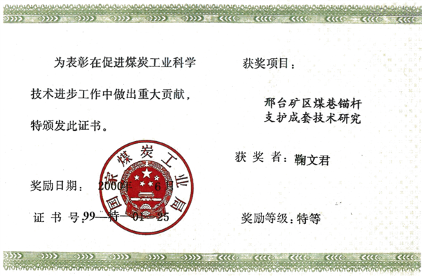1、煤矿巷道高效安全支护成套技术创新体系及应用,国家科技进步二等奖,2005,排名10;