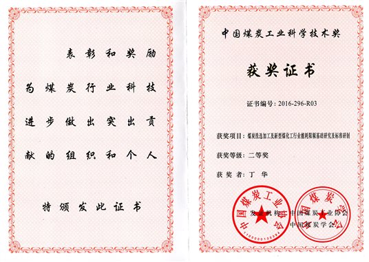 6 | 煤炭洗选加工及新型煤化工行业能耗限额基础研究及标准研制 | 中国煤炭工业科学技术奖 | 二等奖 | 2016 | 3 |