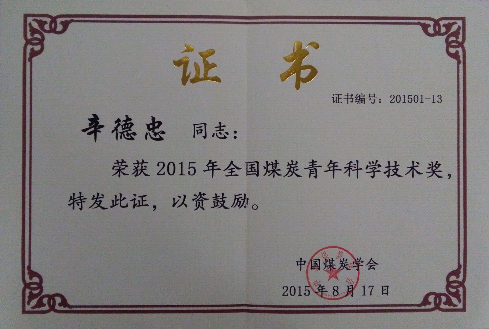 2、2012年“联动ZYW2000/3200/4000煤矿用全液压系列钻机的研制”获中国煤炭工业科学技术奖三等奖