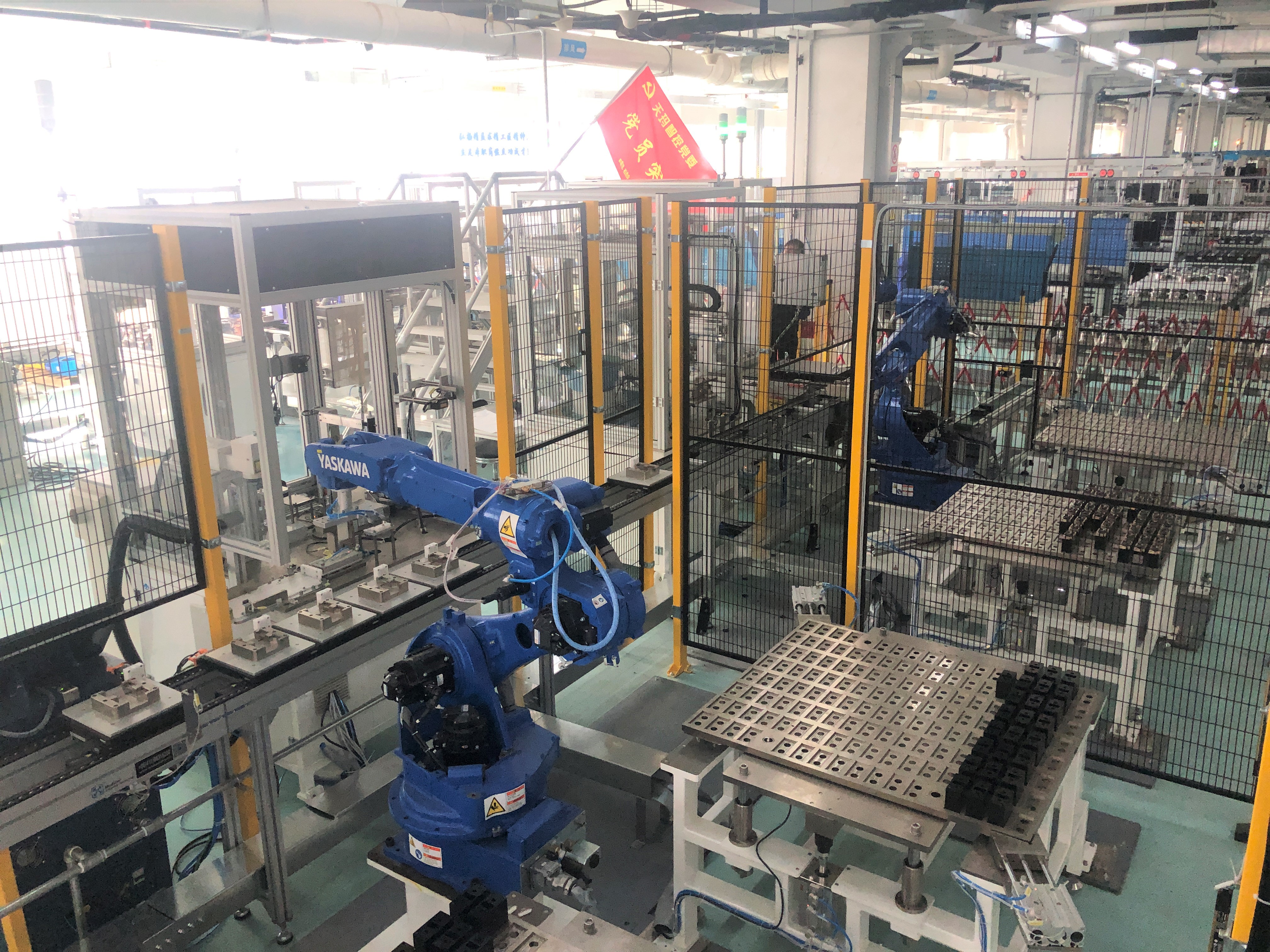 项目团队攻克了零件自动上料、自动涂胶、在线检验等多项技术难题,实现了电磁铁的柔性智能装配。该产线包含15个工作站、9台机器人,通过自动分拣、深度学习等技术手段有效实现提质增效降本,操作人员减少8名,效率提升211%,保证电磁铁产品年产能要求。