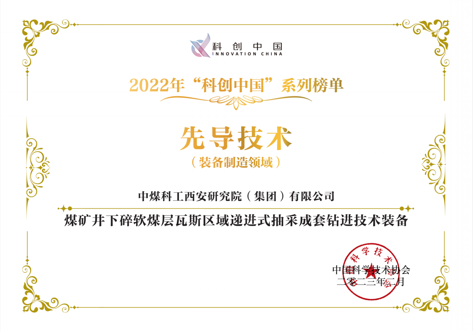 “科创中国”先导技术榜是中国科协2020年打造的榜单品牌,旨在推介代表前沿水平的技术成果,为技术成果转化和产业落地发挥带动和示范作用,推动科技资源聚合优化,促进科技与经济深度融合。2022年“科创中国”先导技术榜采用“5+1”评选体系,设电子信息、生物医药、装备制造、先进材料、绿色低碳等五大产业领域和产业基础一个专项领域。由全国学会、协会、研究会、各省市科协、中央企业科协等推荐,经初评、终评环节,共遴选出实现重大技术突破、推广潜力巨大的150项先导性技术。西安研究院入选的“煤矿井下碎软煤层瓦斯区域递进式抽采成套钻进技术装备”成果是“装备制造”领域的25项技术之一。